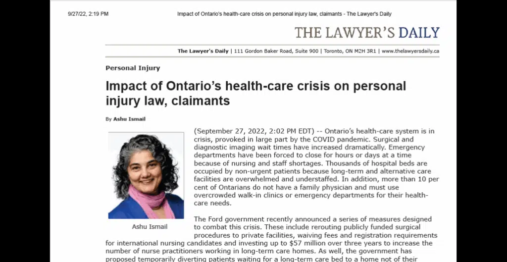“Impact of Ontario’s Healthcare Crisis on Personal Injury Law, Claimaints” describes the current state of personal injury law from two important perspectives: first, from the perspective of the litigation process and resulting outcomes, and secondly, from the perspective of accident victims’ recovery experiences and mental health. Both of these areas are suffering as a result of the healthcare crisis.
