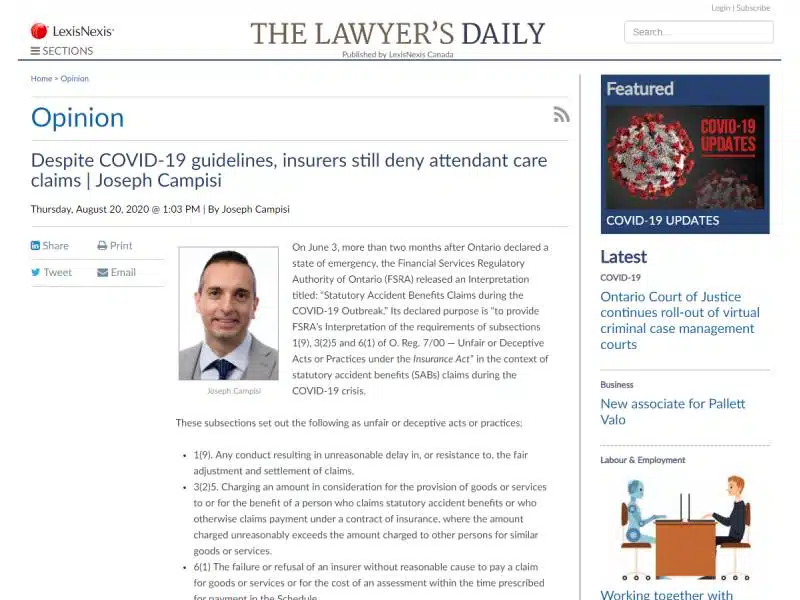 FSRA’s release of this document highlights the use of unfair or deceptive acts or practices by the insurance industry relating to accident benefits claims in the first months of the crisis, despite website slogans of insurers, like: “Working together to deal with COVID-19” and “We believe that insurance is about people. Our priority is to be there for customers and brokers when they need us.”
